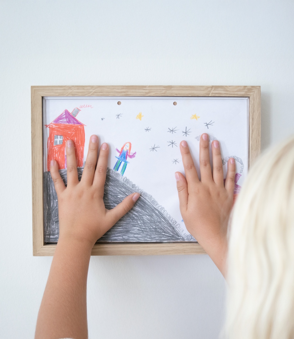 Mit unserem RAM’N-Rahmen aus Eiche mit klarem Acryleinsatz lassen sich Kinderzeichnungen in nur wenigen Sekunden einrahmen. Kinder können ihre Kunstwerke ganz einfach selbst präsentieren, und mit Platz für bis zu 50 Zeichnungen wird der kreative Prozess wichtiger als die „perfekte“ Zeichnung.